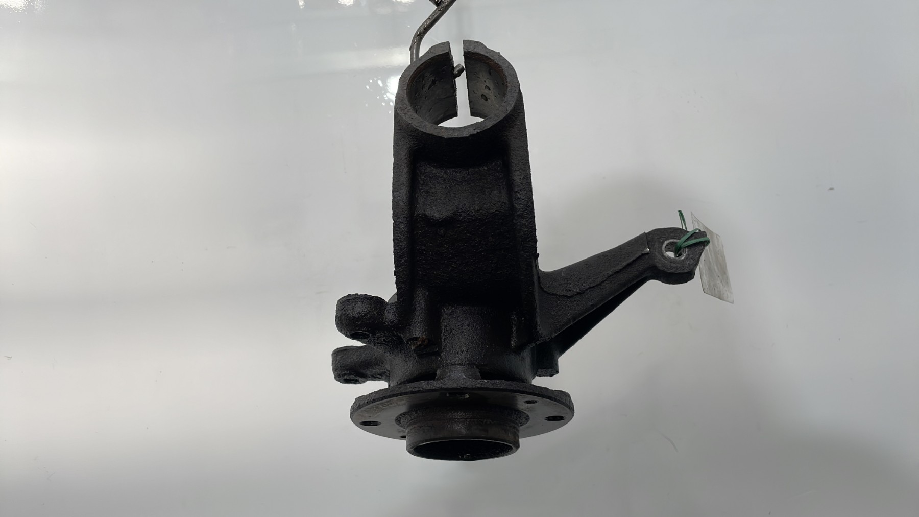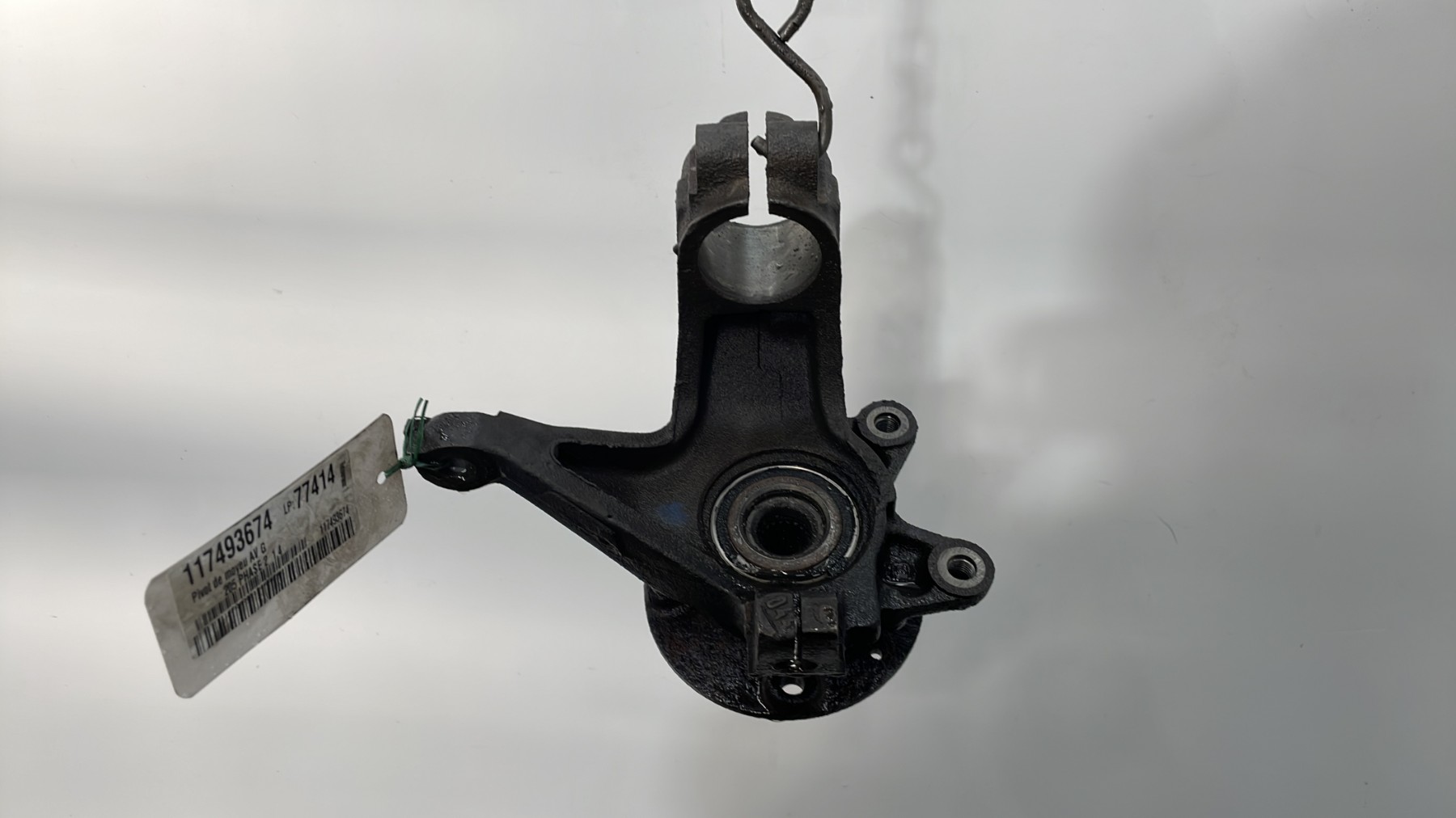 Fusée d’essieu avant gauche d’occasion. Cette pièce assure la liaison entre le moyeu de roue et la suspension, permettant une direction précise et un contrôle optimal du véhicule.